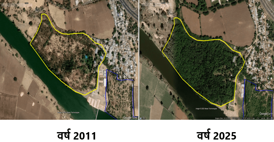 Before-and-after visuals tell the story clearly: barren land replaced by layered vegetation, visible even on satellite imagery.