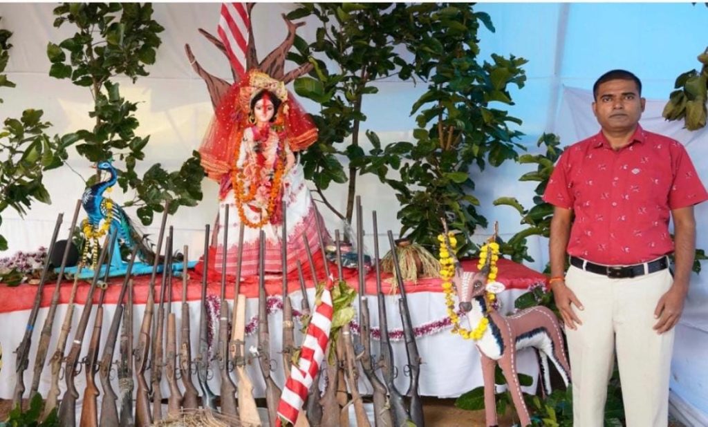 Active hunters stepped forward. Before the idols of Van Devi and Prakriti Devi, they surrendered 23 country-made guns, along with hunting nets and slingshots.