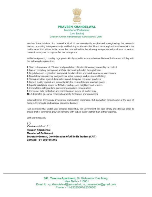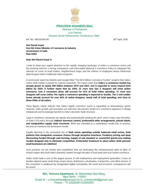 Khandelwal emphasized that India’s retail sector remains one of the largest generators of employment and self-reliance, and any policy vacuum could accelerate its erosion. Referring to Prime Minister Narendra Modi’s emphasis on Atmanirbhar Bharat, he stated that strengthening domestic trade and ensuring fair competition must remain central to India’s economic strategy.