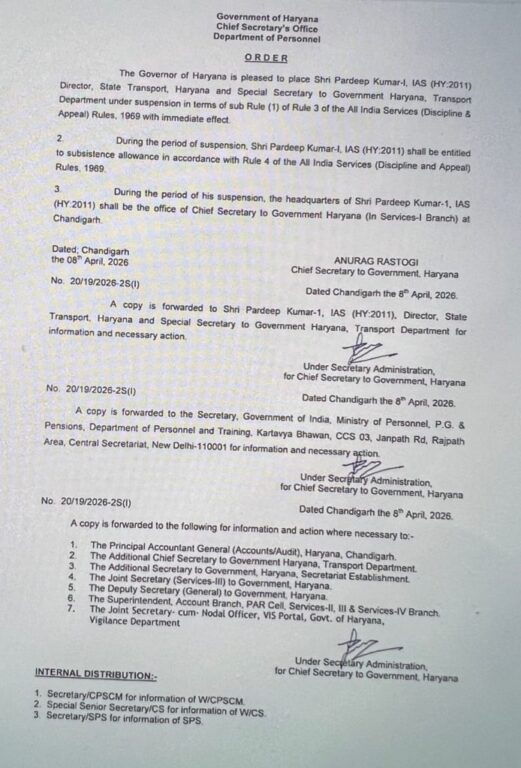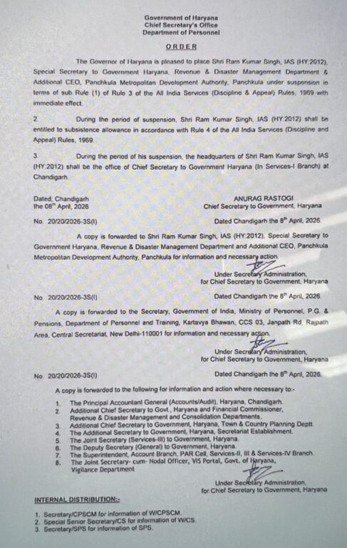 The suspended officers are Pradeep Kumar, a 2011-batch IAS officer, and Ram Kumar Singh, a 2012-batch IAS officer. Both officers were suspended through separate orders issued by Haryana Chief Secretary Anurag Rastogi on Wednesday night.